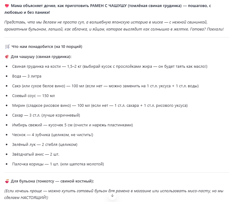 Например, я попросил систему объяснить, как приготовить блюдо Рамен с говядиной.