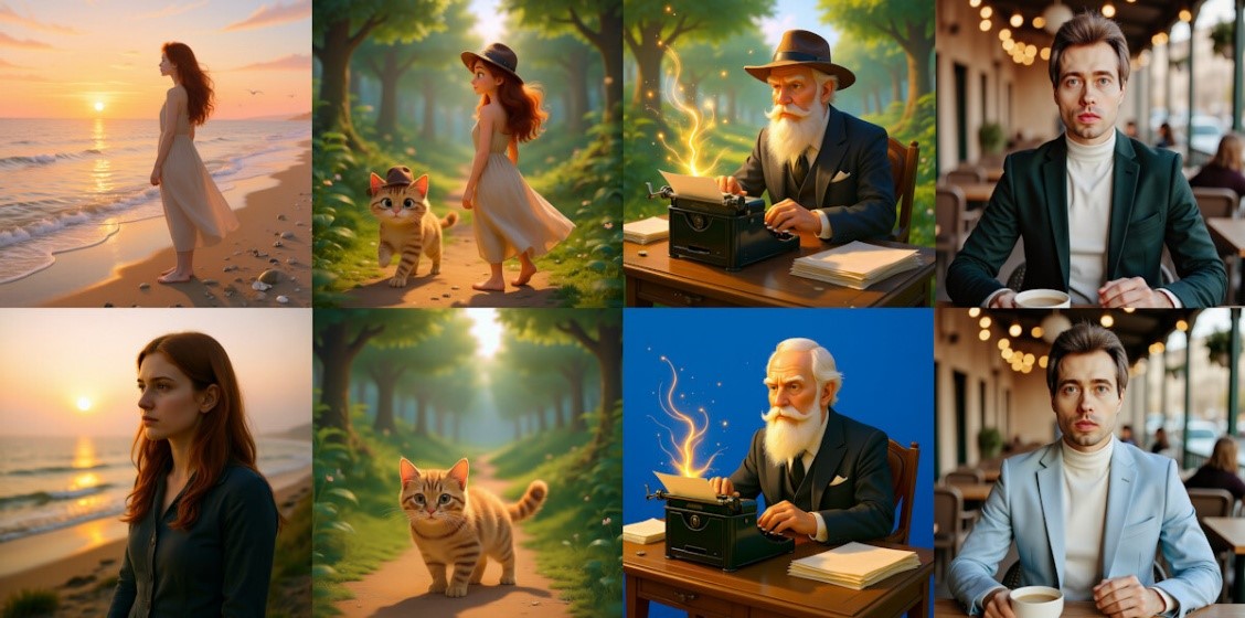 Первые три картинки в каждом ряду – генерация внутри Qwen.
