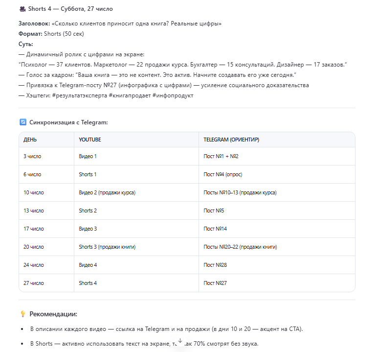 В моем примере я попросил синхронизировать материалы в Телеграм-канале и на Youtube, чтобы было логично: