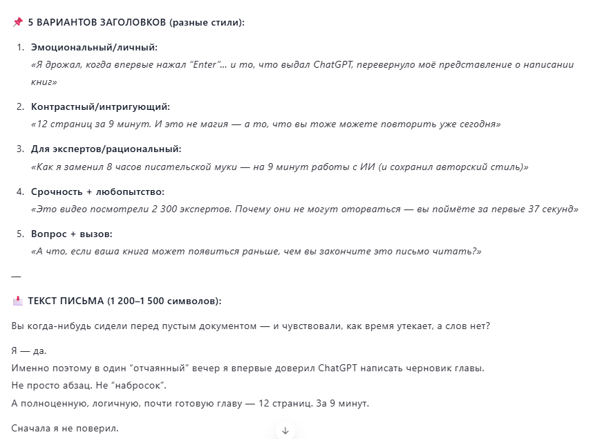Например, я могу попросить придумать темы для моих книг, а потом – написать подробную структуру каждой.