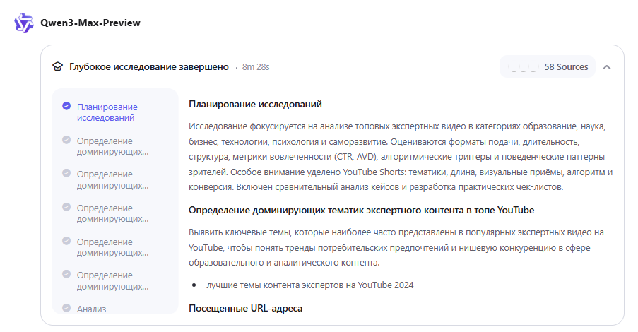 12. В сервисе есть функционал исследований DeepReserch для быстрого погружения в определенную тему.