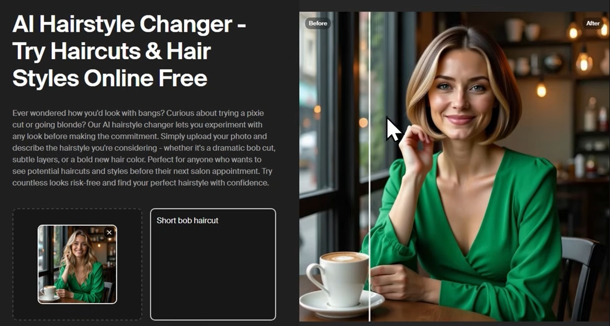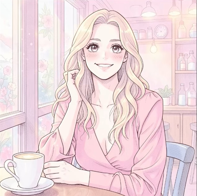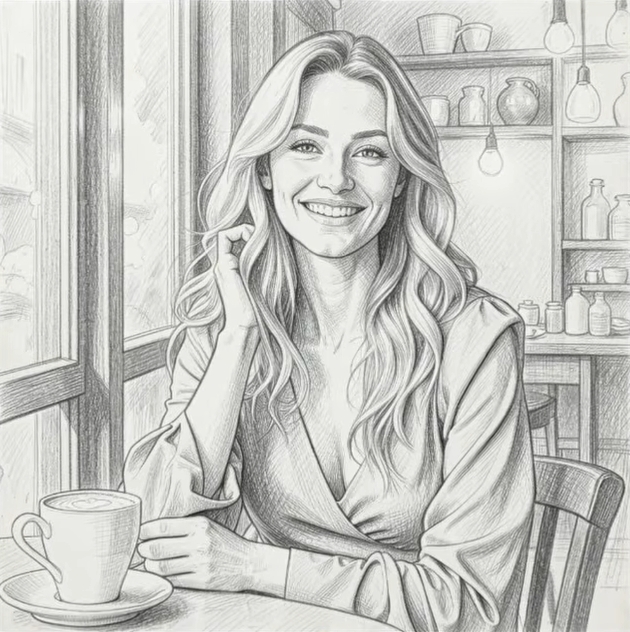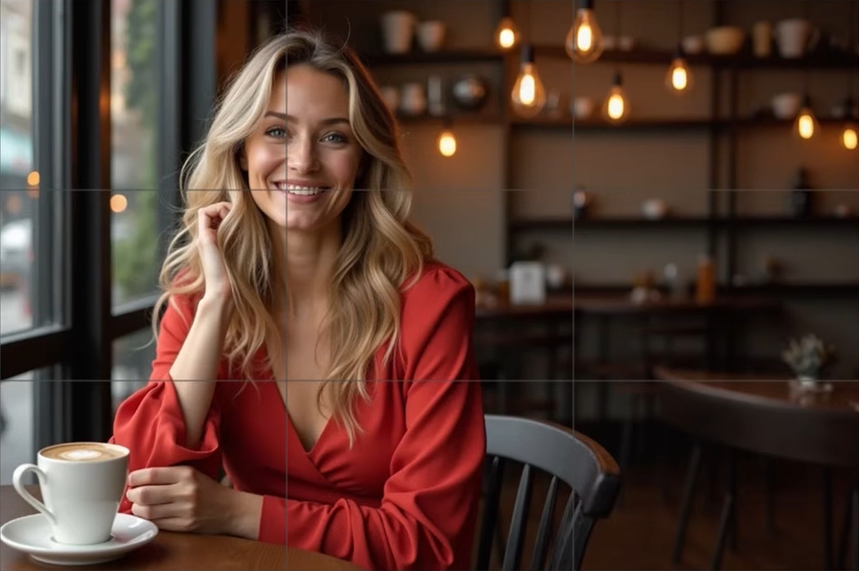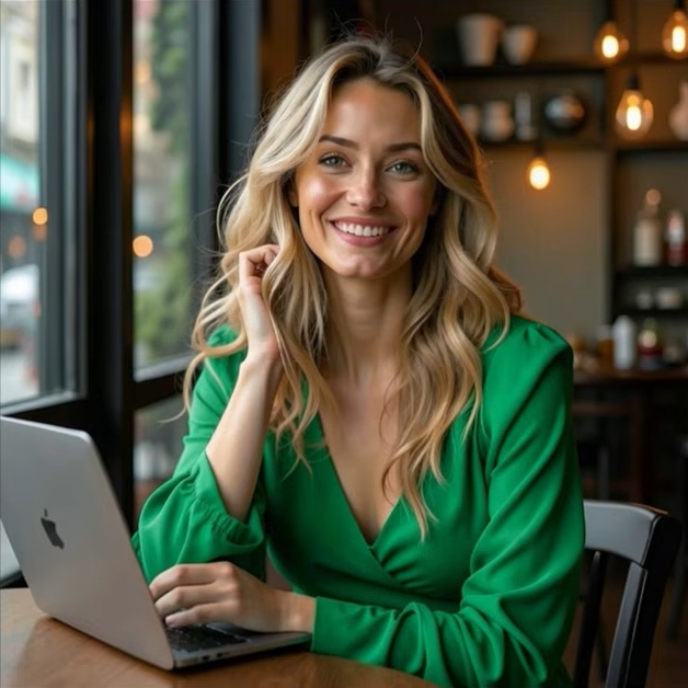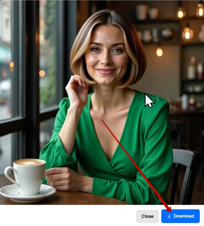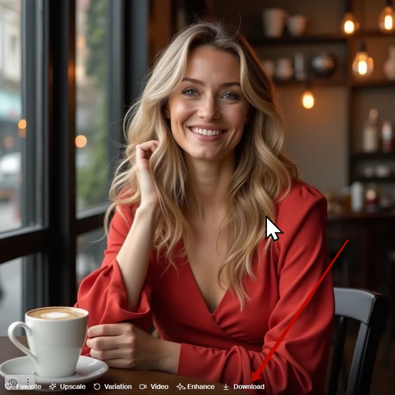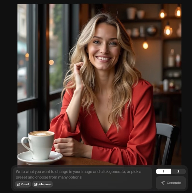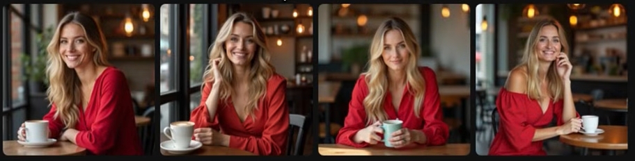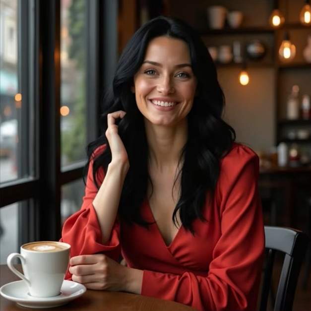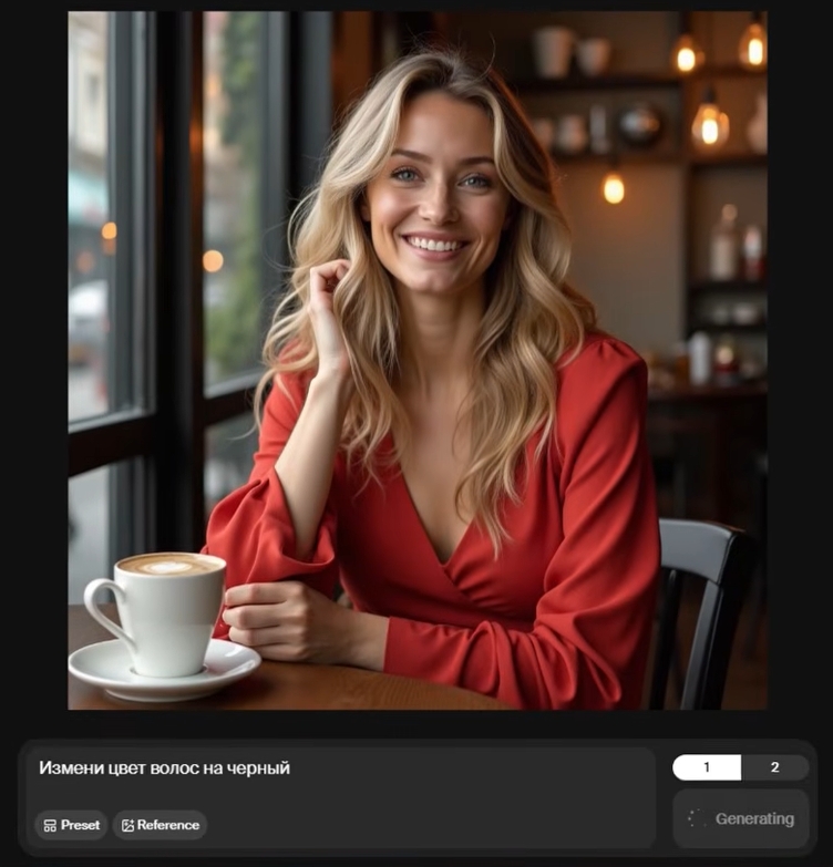 Мой промпт: Женщина лет тридцати с длинными светлыми волосами в красном платье сидит в кафе с чашкой кофе
