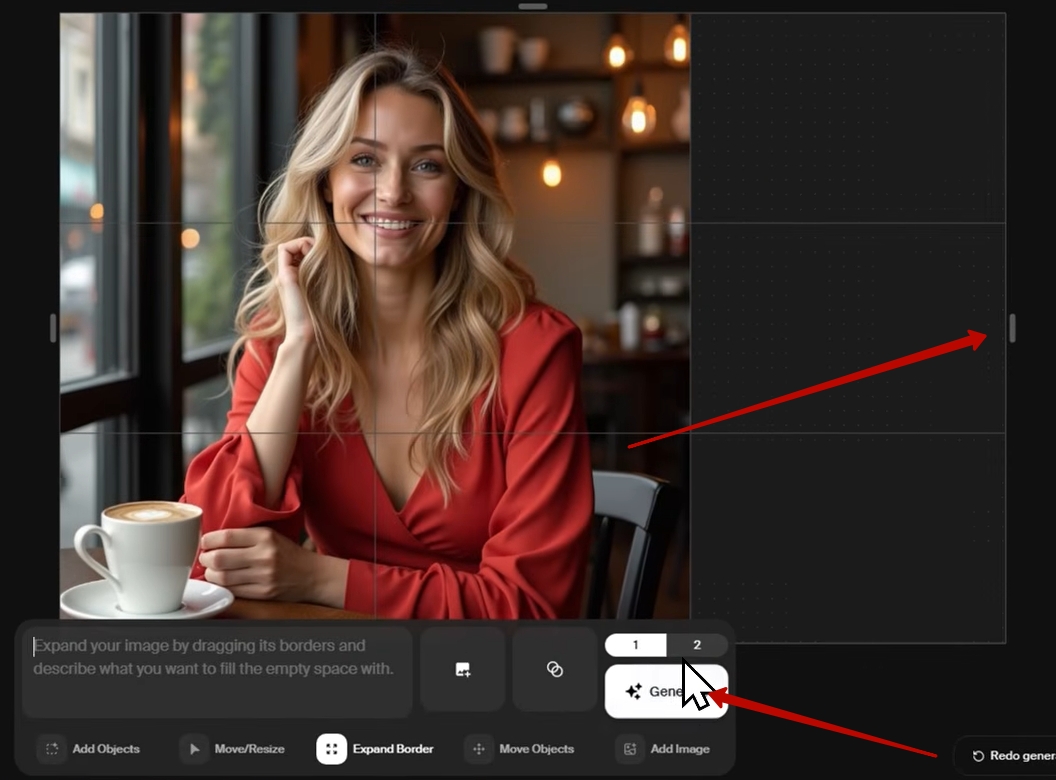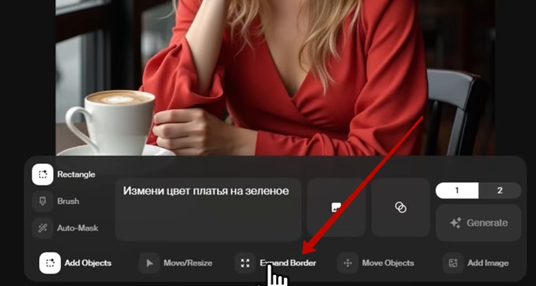 - Растяните область изображения в ту сторону, куда вы хотите его расширить и нажмите кнопку Generate, в промпте можно ничего не писать: