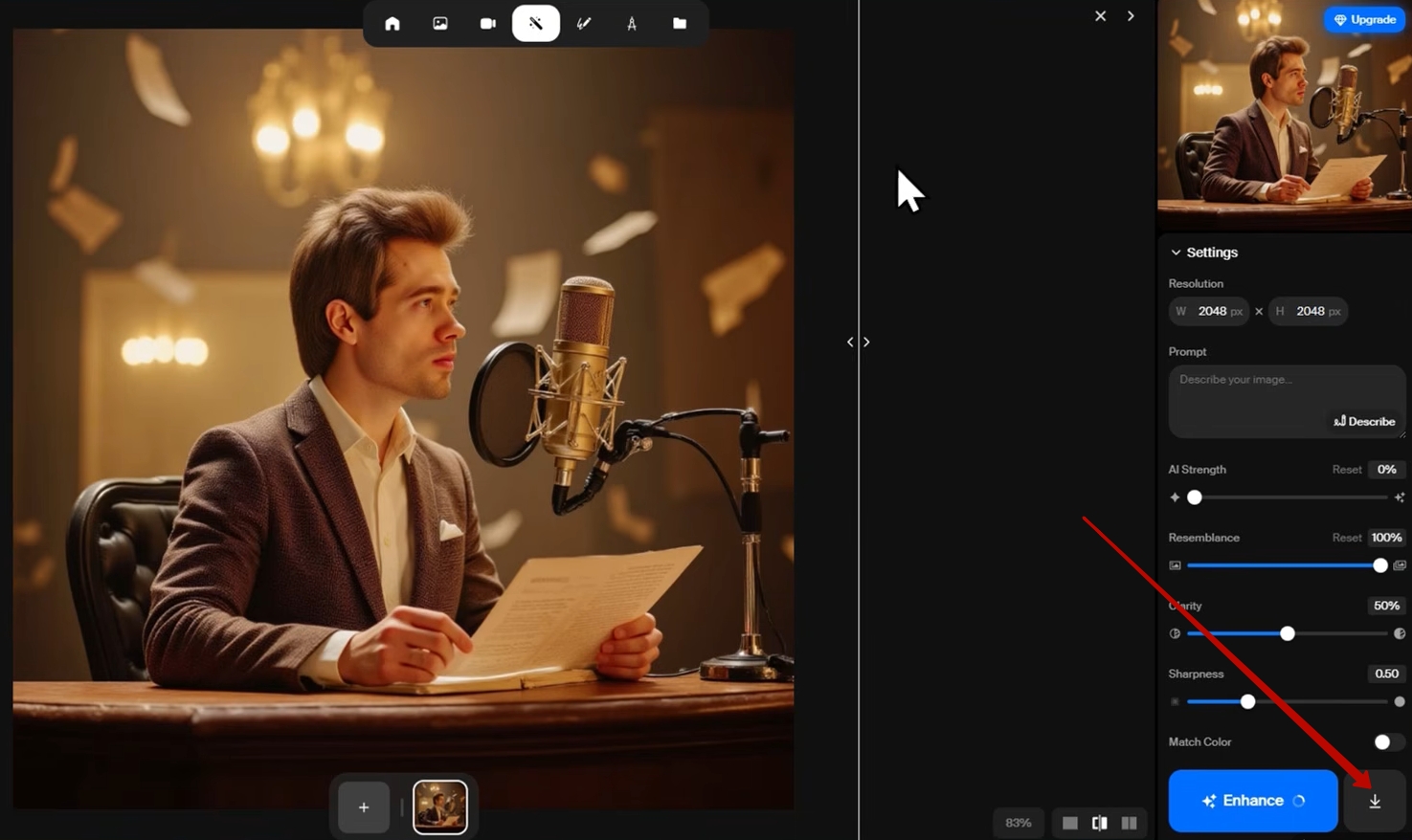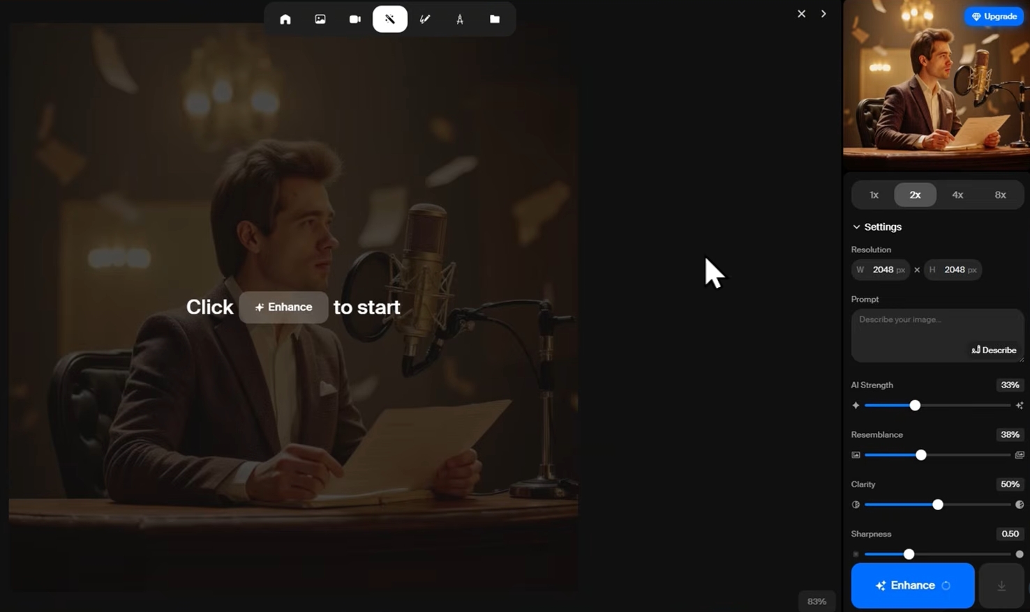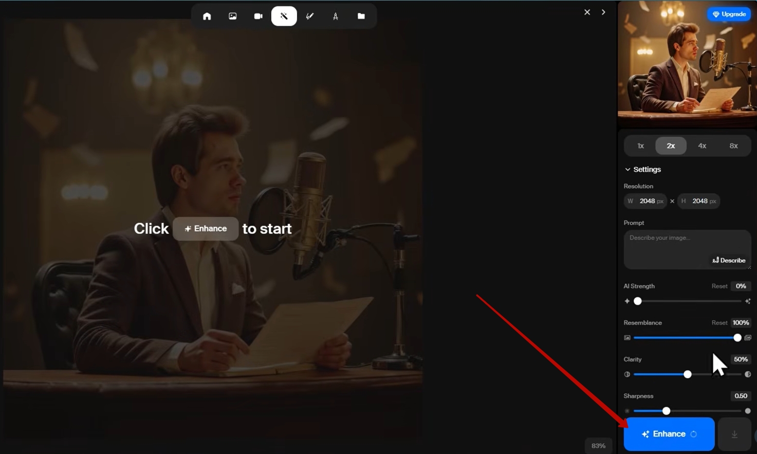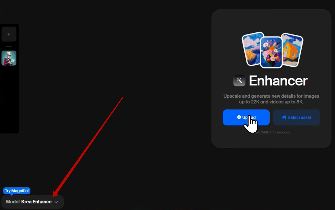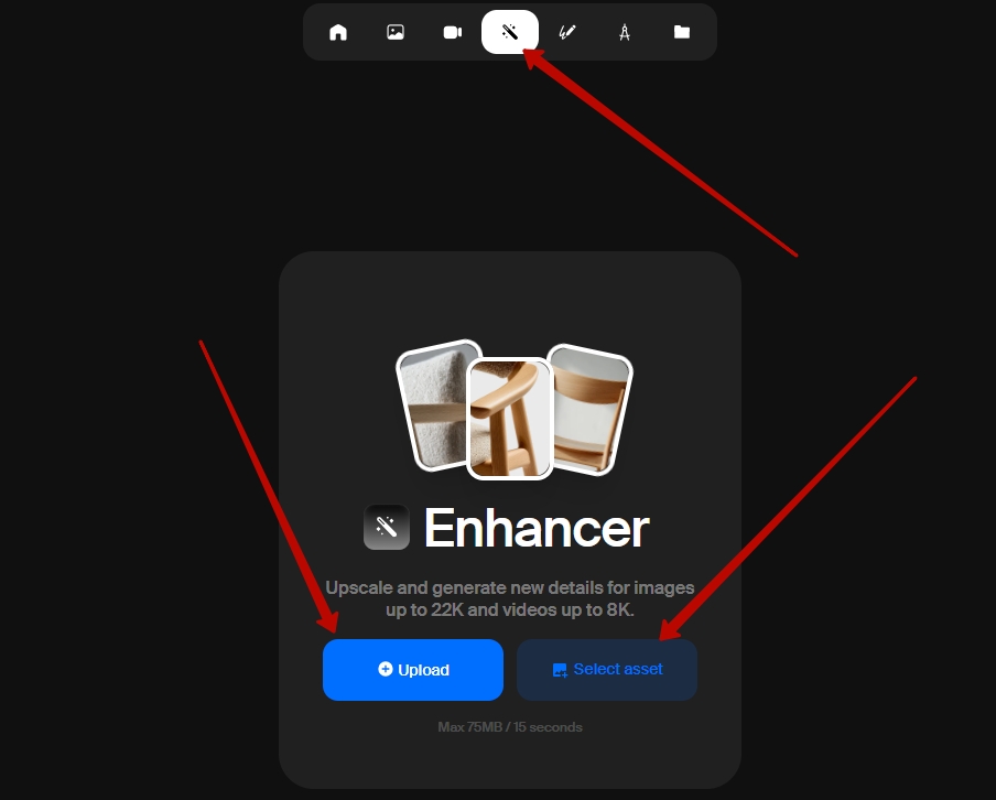 - Перейдите во вкладку Enhancer – здесь также можно выбрать ранее сгенерированную картинку или загрузить с компьютера: