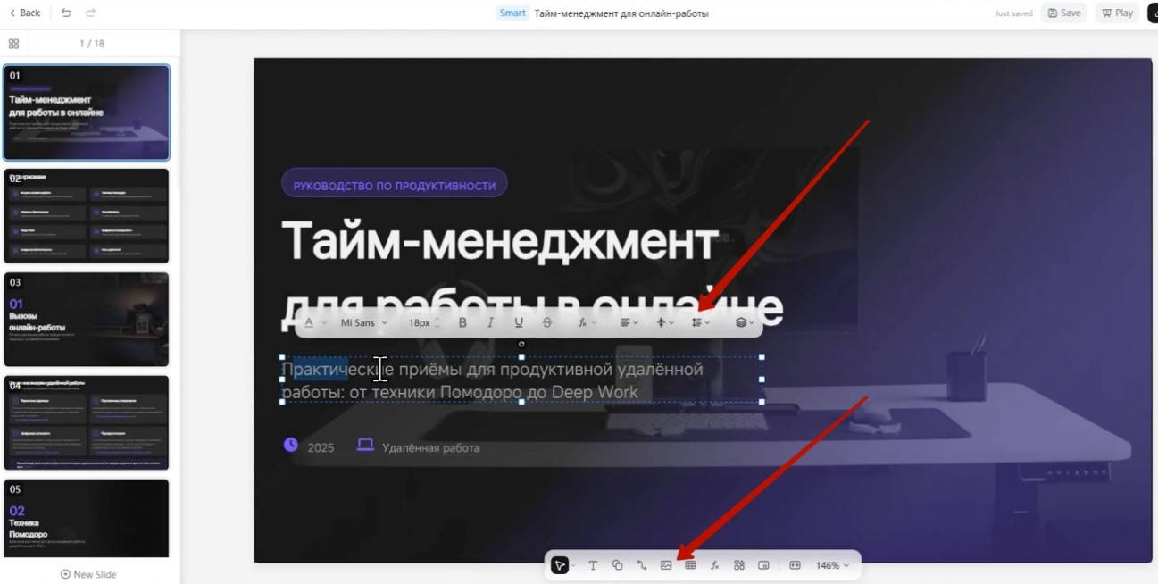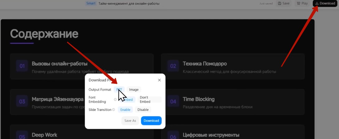 - Напишите ваш промпт, например: Сделай презентацию на русском языке про приемы тайм-менеджмента для тех, кто работает онлайн