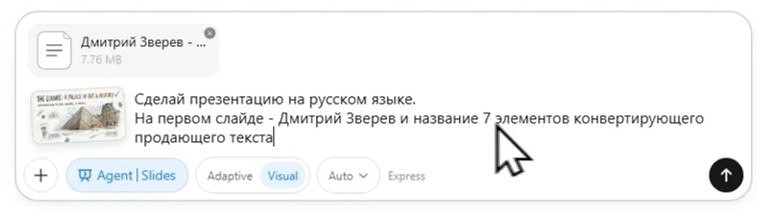 Естественно, можно писать и длинные промпты, загружать готовый длинный текст презентации с разбивкой по слайдам.