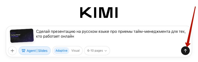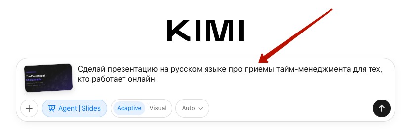 То есть вы можете предварительно сделать полную проработку слайдов самостоятельно, либо через нейросеть, вставить этот текст в Kimi и система будет следовать вашей структуре.