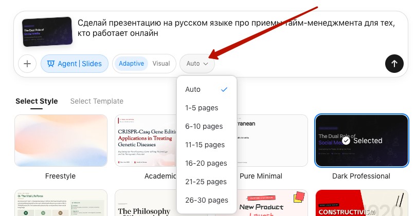 - Выберите количество слайдов – на автоматическом режиме система сама определит нужное количество а слайдов с учётом вашего промпта: