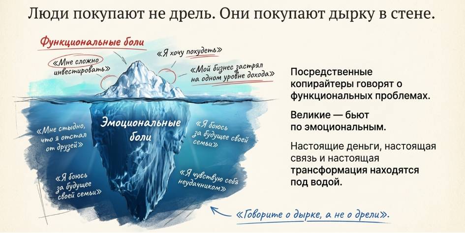 — Знаешь, в чем разница между посредственным копирайтером и великим? Посредственный обращается к функциональным болям. Великий бьет по эмоциональным. — Он постучал пальцем по правой колонке. — Вот где настоящие деньги. В эмоциях.