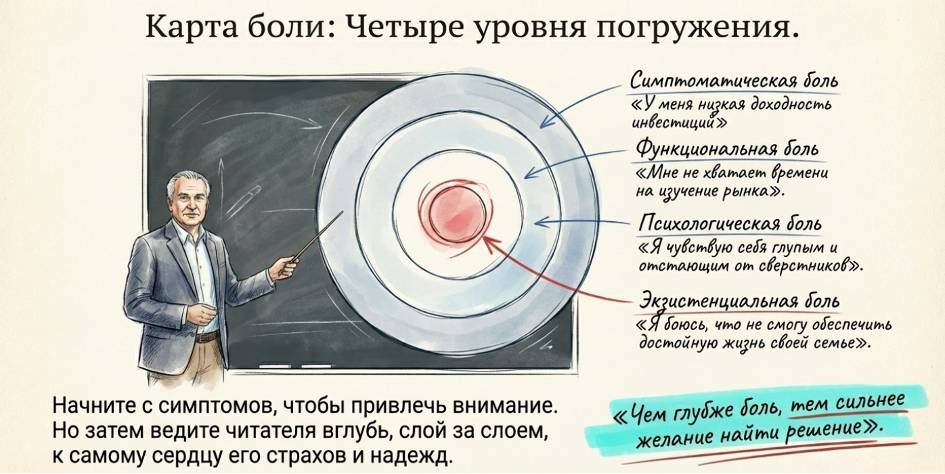 — Конечно, оно решает практические проблемы. И ты будешь об этом говорить. Но это не то, что заставит людей платить. — Он нарисовал в блокноте круг с концентрическими кругами внутри. — Смотри. Это карта боли, разработанная на основе подхода, который я адаптировал от нескольких мастеров копирайтинга.